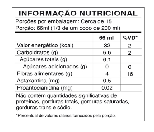 - Sugestão de consumo: Beber 1/3 de um copo de 200ml por dia (66ml).